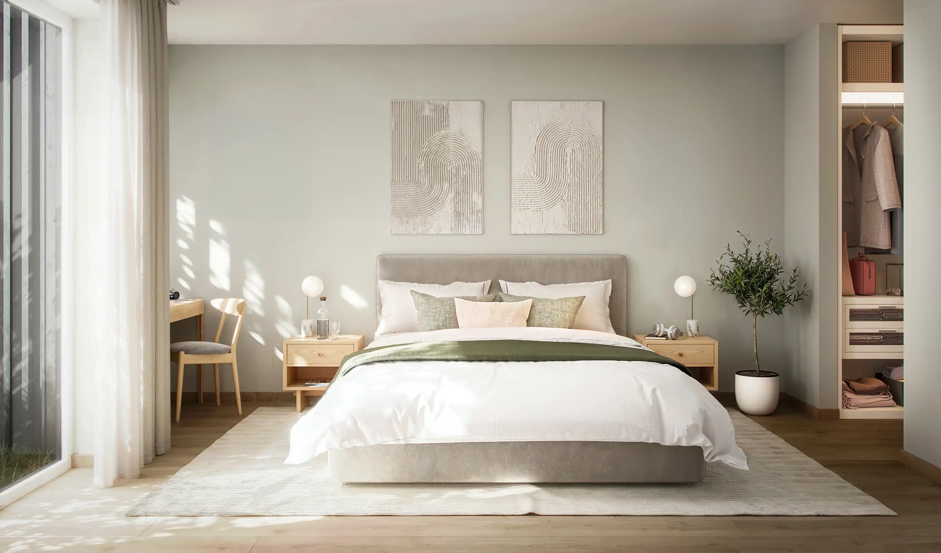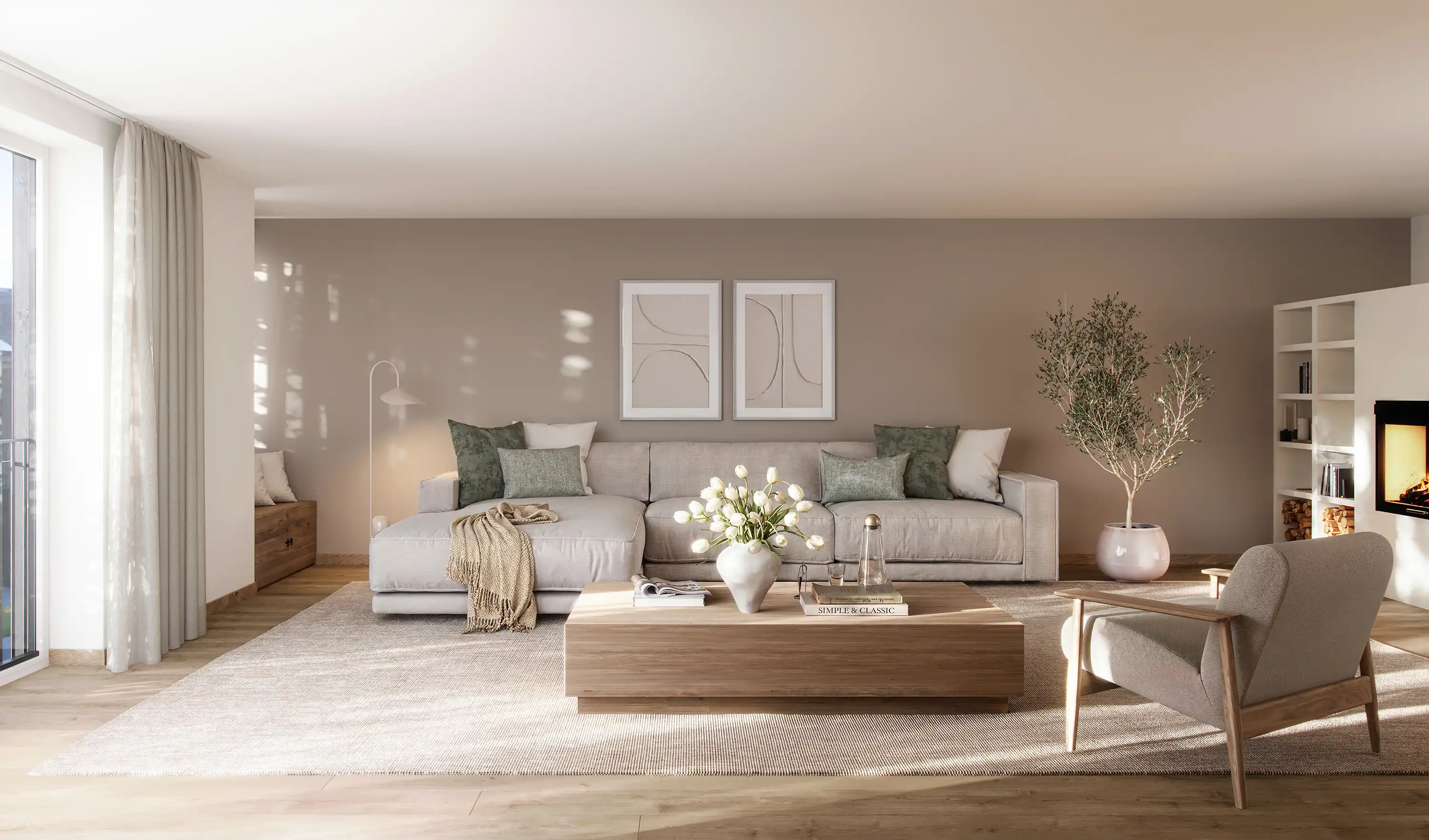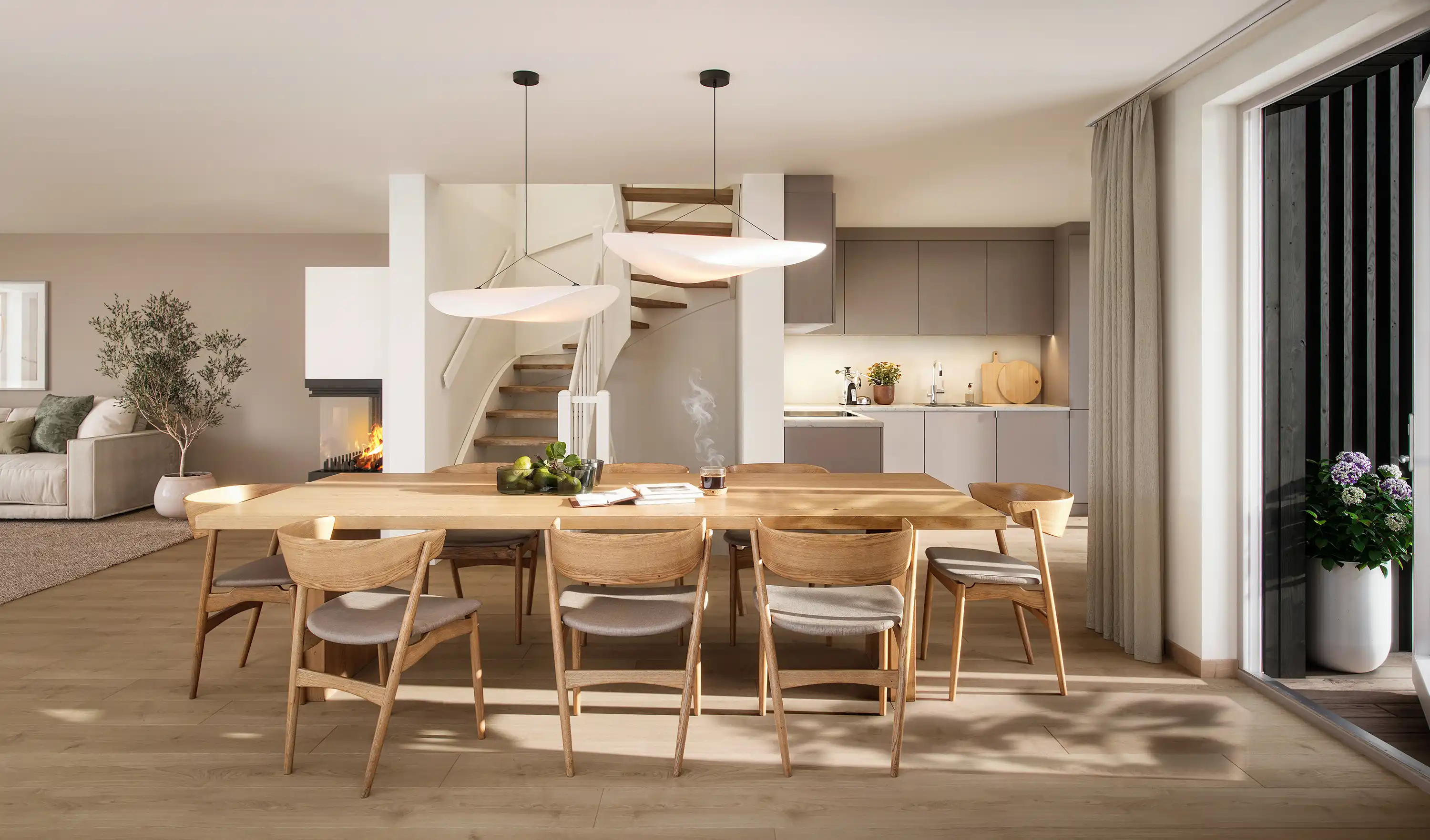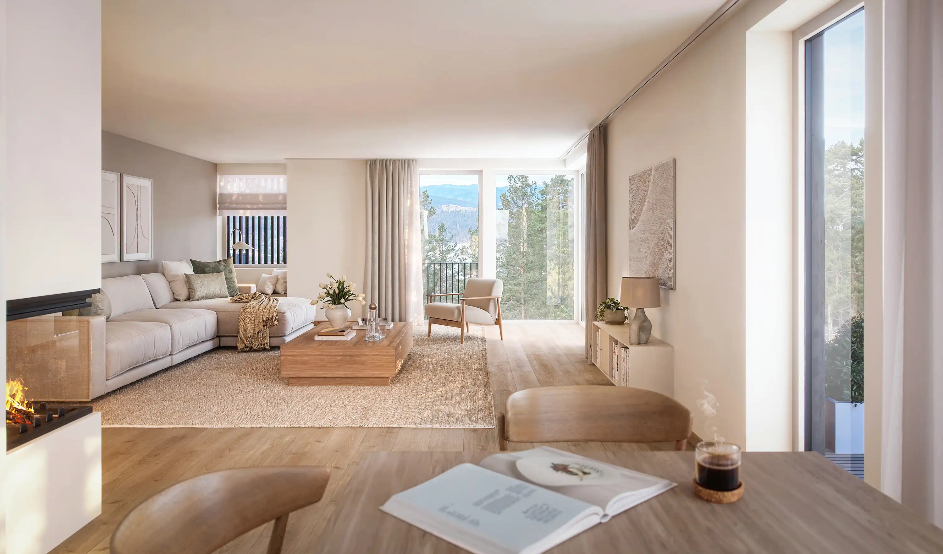 Kobberhaugen handler om følelsen av å komme hjem. Når dagen roer seg og du kjenner varmen fylle rommet. Stemningen er avslappet og innbydende – som å sitte foran en peis med et mykt pledd og et rolig lys rundt deg. Kjøkken og bad har detaljer i valnøtt som gir dybde og varme. Treverket har naturlige årringer og en mørk glød som står fint til varme greige toner. Sammen gir de et moderne, men samtidig koselig uttrykk. Her kan du lande etter en lang dag. Et sted for rolige morgener, gode samtaler og kvelder med ro og varme.
