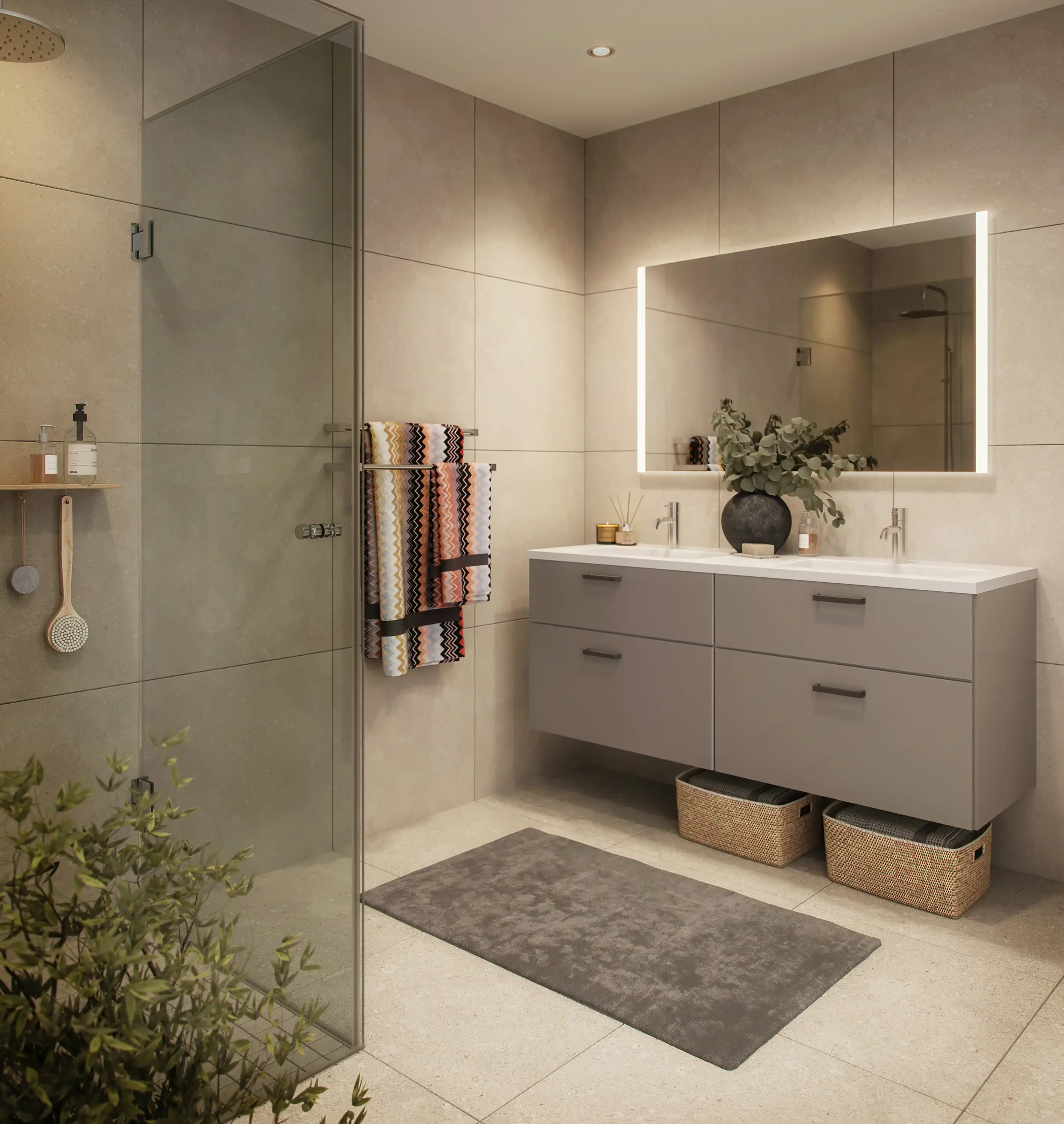 Kikut henter inspirasjon fra naturen – fra fjellets rolige styrke og det varme lyset som treffer stein og jord. Her møter moderne uttrykk naturens egen balanse. Grå nyanser på kjøkken og bad gir et tidløst og rolig preg. Tonene spenner fra lys steingrå til myk skifer, og sammen skaper de en lun atmosfære. Lyset spiller vakkert mot overflatene og gir liv til rommet – som solglimt på en fjellside. Dette er et konsept for deg som liker det enkle og naturlige. Et hjem med karakter, varme og ro.